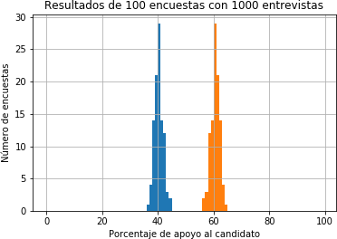 Con el objeto de visualizar mejor el concepto de error asociado con una encuesta, puede ser interesante realizar este proceso varias veces y seleccionar, a lo largo de varias iteraciones, poblaciones diferentes de 1000 individuos. Esto no puede hacerse en la práctica, por los altos costos que conlleva, pero en un escenario sintético como el presente, el proceso se lleva a cabo en sólo unos segundos. De hecho, se ha creado la rutina “subpob_s” para ejecutar esta función. La rutina devuelve una matriz V que contiene los porcentajes (del 0 al 100) de apoyo a los diferentes candidatos en las diferentes iteraciones. Tales resultados pueden ser tabulados en un histograma, como se muestra en la Figura 1. En la ilustración resulta interesante observar la distribución, aproximadamente normal, de los diferentes resultados que oscilan dentro del margen de error.
