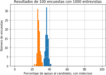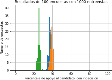 En el comando descrito en la llamada de rutina anterior, los individuos que apoyan al candidato naranja afirman estar decididos en el 65% de los casos, mientras que, para el candidato azul, el porcentaje de decididos es de un 90%. Esta distribución le quita peso al apoyo del candidato naranja, que queda oculto en el rubro de los indecisos (marcado en verde en la figura 2) produciendo un empate técnico entre los candidatos y una indecisión de alrededor del 23%. Como el escenario es controlado mediante código, el número de indecisos es la cantidad de individuos encuestados que tienen un 0en la columna de decisión. En otras palabras, la columna de indecisión PI puede interpretarse como un tercer candidato, que retira votos de los otros dos, con su correspondiente valor medio y margen de error. En la Figura 2 es claro que las distribuciones entre ambos candidatos se solapan, produciendo un empate técnico. Se han tomado 100 grupos de 1000 individuos cada uno para producir estos histogramas. En verde se despliega la distribución de los indecisos