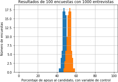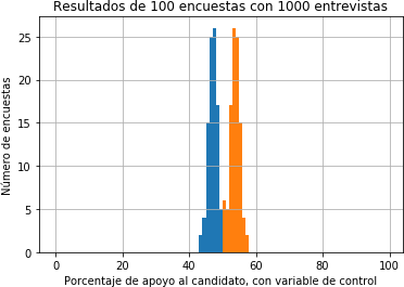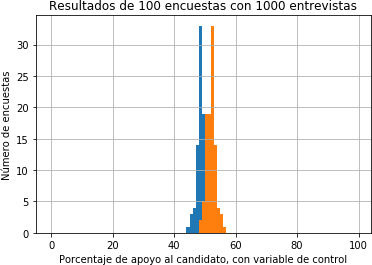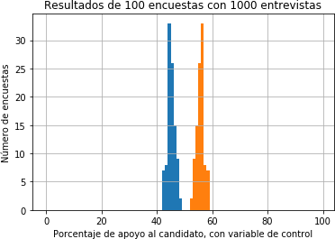 El hecho es que, en la práctica, aunque se hayan tenido los mayores cuidados en que la muestra de1000 individuos esté equilibrada y represente adecuadamente la totalidad de la población, el número efectivo de individuos que responden la encuesta puede estar sesgado y por tanto los resultados obtenidos con base en ellos deberían ser compensados. Esto se puede lograr, por ejemplo, con una variable de control cuya distribución en la totalidad de población sea conocida de antemano mediante un censo. Si la distribución de esa variable no es igual en la población de individuos que respondieron la encuesta, entonces es posible concluir que existe un sesgo en el resultado del sondeo. La forma de compensar ese sesgo consiste en aumentar, de manera proporcional, el peso de las decisiones delos individuos que están subrepresentados, mientras se disminuye el peso de las decisiones de los individuos que están sobrerrepresentados. Es claro que encontrar estas variables de control requiere de un mayor número de preguntas en la encuesta que puedan ubicar al individuo según su estrato económico, nivel de educación, edad, o cualquier otro dato que permita comparar la distribución de estas variables con la de la población total.