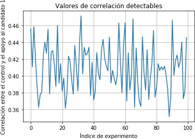 Como se desprende de lo anterior, el proceso es simple siempre que sea posible encontrar la variable VC. Para simular este escenario en Python, se procede a fabricar, de manera general, una variable que tenga una cierta correlación c con la variable X que determina el apoyo a un cierto candidato en la población. X se representa mediante un vector columna con valores de 1 o 0 (aunque en principio, este enfoque tan simplista podría alterarse) mientras que VC es un vector con valores discretos de acuerdo con el número de categorías m.