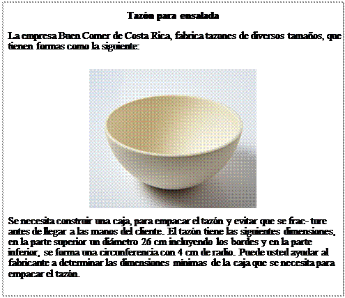 Por lo tanto, la respuesta corresponde a indicar que el valor entero mínimo en centímetros de la altura del interior de la caja que se necesita para empacar el tazón es de 13 cm. Y esto implica que la caja debe tener las siguientes dimensiones aproximadamente, largo y ancho de 26 cm con una altura de 13 cm.