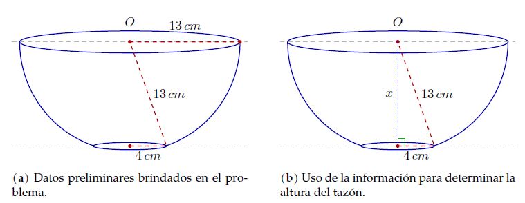 Es importante aclarar, antes de presentar la solución del problema que, para efectos de la mediación pedagógica en el aula, se omiten elementos geométricos formales en el problema, de manera que se presente como una situación cotidiana, sin embargo, el docente debe estar atento a la importancia de aproximar la realidad a exactitud o rigurosidad matemática, por ejemplo, se debe asumir que el tazón tiene una forma semiesférica y que los planos involucrados son paralelos. Además, que la caja es un paralelepípedo y que las dimensiones deben ser una aproximación de la longitud real, por tanto, se debe determinar el valor entero mínimo en centímetros de la altura del interior de la caja, así como de su base.