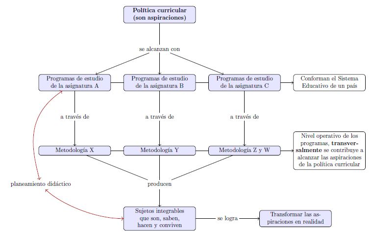 En la figura1.4 es importante señalar que la política curricular no es operacional por sí misma, es a través de los programas de estudio que se propician actividades en las aulas para alcanzar las aspiraciones que están plasmadas en ella. De acuerdo con Bongco y David (2020) comprender las aspiraciones de la política curricular es de suma importancia cuando se lleva a cabo la implementación de los programas oficiales de cualquier asignatura, pero eso no interfiere con la ejecución individual de cada programa.