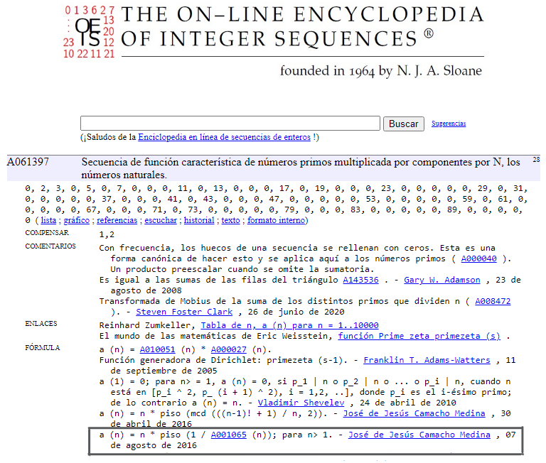 Un primer acercamiento a la fórmula propuesta se da en el verano de 2016 cuando la enciclopedia en línea de secuencias enteras (oeis.org) aprueba el alta de una fórmula como aporte a la entrada A061397 la cual lleva como título: “Secuencia de función característica de primos multiplicados por componentes N, los números naturales”, véase la figura 1.