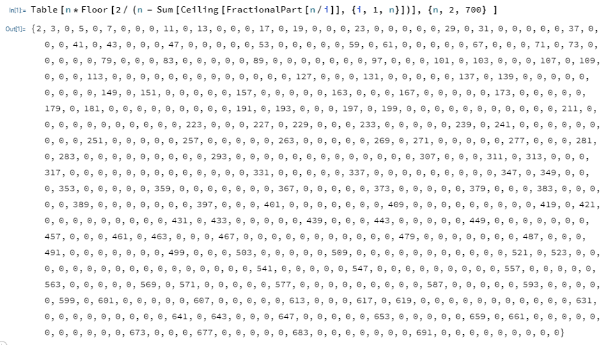 La esencia de la fórmula de la figura 1 es realizar una división entre el uno y la suma de divisores de menores a, para luego aplicar la función piso, esto conlleva a que se obtenga uno cuando sea un número primo y cero para un número compuesto. De esta manera la expresión produce a la secuencia:
