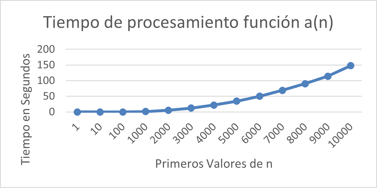 A partir del análisis de los tiempos de procesamiento y la gráfica (ver figura 3) obtenida de los datos computados, y tomando como referencia a la tabla de complejidad algorítmica; se visualiza un orden de tipo exponencial para la función.