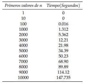 Esto nos permite concluir que a medida de que se computen valores para; el coste computacional tendrá un aumento considerable, por ejemplo: para los primeros 20,000 valores de el tiempo de procesamiento es de 563.218 segundos lo cual representa el 381.24% en comparación al tiempo que conlleva procesar los primeros 10,000 valores de. La función es entonces una expresión inviable en la práctica computacional, no obstante, tiene un orden de complejidad algorítmico menor al orden factorial como el que maneja la fórmula de Willans (1964); la cual se basa en el teorema de Wilson y por ende hace uso de la operación factorial.