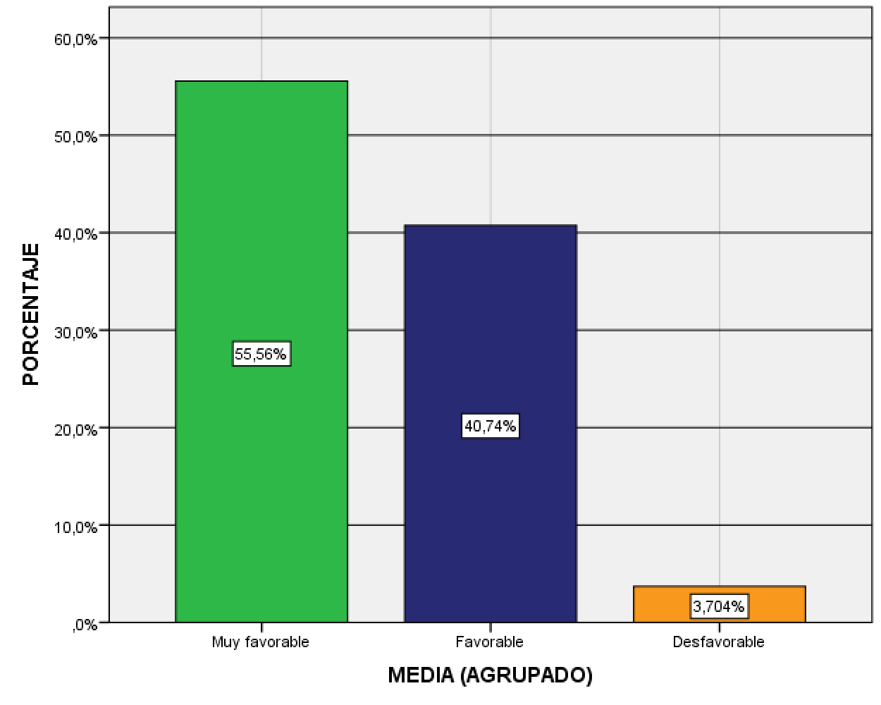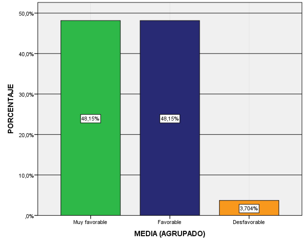 Con el objetivo de obtener una medición global de las percepciones de opinión plasmadas en la escala Likert, en la dimensión de “actividades asistidas por computadora basadas en el uso de CDFs”, se utilizó el software SPSS para crear una variable denominada MEDIA donde se acumuló la media aritmética “n” de los registros por individuo, que fueron codificados en valores correspondientes a: “1 = Muy de acuerdo”, “2 = De acuerdo”, “3 = Mediamente de acuerdo”, “4 = En desacuerdo” y “5 = Muy en desacuerdo”. Luego, para analizar el resultado de las medias aritméticas se consideró la siguiente escala de interpretación: 1 ≤ n < 2 fue valorada como “Muy favorable”, 2 ≤ n < 3 se asoció como “Favorable”, 3 ≤ n < 4 se clasificó como “Desfavorable” y 4 ≤ n ≤ 5 se valoró en la categoría