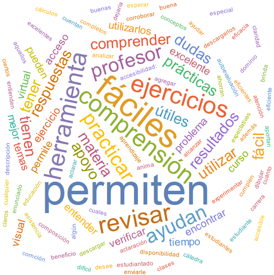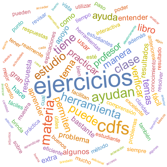 La Figura 2 comparte una nube de palabras obtenida mediante el uso del lenguaje Wolfram, a partir de las respuestas brindadas por los alumnos con respecto a la pregunta abierta del cuestionario, donde señalaron tres fortalezas de las ACDFs. La nube es consistente con las categorías de respuesta encontradas bajo el criterio de al menos una coincidencia de opinión en un 70%. Se aprecia cómo los estudiantes aprueban las actividades asistidas por computadora al permitir: resolver problemas y ejercicios, practicar y revisar resultados, y brindar una alternativa distinta para desarrollar los procesos de enseñanza y aprendizaje que contribuye con un entendimiento más benigno de los contenidos.
