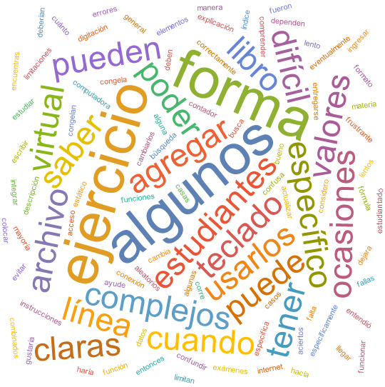 El cuestionario aplicado a los 27 estudiantes de los grupos experimentales incluyó dos preguntas abiertas con la intención de determinar fortalezas y debilidades reveladas en los documentos con un formato computable elaborados para el curso MAT030. En la Figura 4 se observa una nube de palabras relacionada con las fortalezas detectadas por la muestra y en la Figura 5 una nube de palabras asociada con las debilidades manifestadas. Ambas nubes de palabras se gestaron en el software Wolfram Mathematica pasando de manera directa las respuestas de opinión de los alumnos participantes. Entre las fortalezas recurrentes con un 70% de aparición, se destacan: eficientes herramientas para el estudio individual, permiten verificar resultados paso a paso y respuestas directas sin depender del docente, siempre están disponibles (localmente o en la web), son claros y sencillos de usar, permiten practicar los temas del curso con ejercicios pseudoaleatorios y son un excelente complemento educativo abriendo nuevas formas de abordaje de todos los contenidos de la materia MAT030. En lo referente a las debilidades identificadas con un 70% de coincidencia, los alumnos señalaron: se requiere el uso y conocimiento de símbolos muy específicos en algunos CDFs para procesar la información deseada e interpretar algunos datos de salida, los CDFs en la web tienden a tardar mucho en su respuesta o eventualmente a congelarse, los CDFs podrían fomentar el plagio y generar cierto grado de dependencia si se abusa de su utilización al evitar el uso de procedimientos manuales.