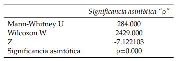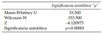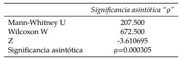 Todas las pruebas de hipótesis Mann-Whitney cuyos resultados se comparten en esta sección, tomaron como referencia la siguiente hipótesis nula (Ho) y la siguiente hipótesis alternativa (Ha):