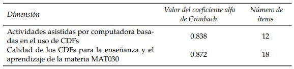 En cuanto a la fiabilidad del instrumento, este fue sometido a un proceso de confiabilidad alfa de Cronbach en las dos dimensiones respecto a las cuales se subdividió el cuestionario, puntualmente estas son: “actividades asistidas por computadora basadas en el uso de CDFs” y “calidad de los CDFs para la enseñanza y el aprendizaje de la materia MAT030”. En ellas, se recurrió al uso de una escala Likert con cinco puntuaciones en el rango: “1 = Muy de acuerdo”, “2 = De acuerdo”, “3 = Mediamente de acuerdo”, “4 = En desacuerdo” y “5 = Muy en desacuerdo”. La Tabla 9 muestra los resultados del coeficiente alfa de Cronbach en cada una de estas dimensiones, hallados, mediante el uso del software estadístico SPSS.