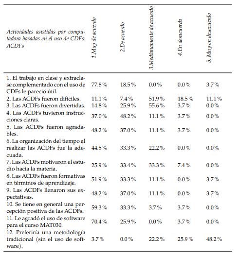 Con base en la Tabla 10, se extrajeron como percepciones positivas, aquellas cuya suma porcentual en las puntuaciones “1 = Muy de acuerdo” y “2 = De acuerdo”, dio como resultado un valor mayor o igual a 70%. En función de ello, se destacan como apreciaciones positivas de las ACDFs las siguientes: el trabajo en clase y extraclase complementado con el uso de CDFs fue útil (96.3%), las ACDFs tuvieron instrucciones claras (85.2%), las ACDFs fueron agradables (85.2%), la organización del tiempo al realizar las ACDFs fue la adecuada (77.8%), las ACDFs fueron formativas en términos de aprendizaje (85.2%), las ACDFs llenaron las expectativas del estudiantado (85.2%), se tiene en general una percepción positiva de las ACDFs (92.6%), agradó el uso de software para el curso MAT030 (96.3%) y se prefiere una metodología no tradicional para la curso MAT030 (74.1%). Por otra parte, se deducen como percepciones negativas: las ACDFs fueron difíciles (70.4%), las ACDFs no fueron divertidas (59.3%) y las ACDFs no motivaron el estudio hacia la materia (40.7%).