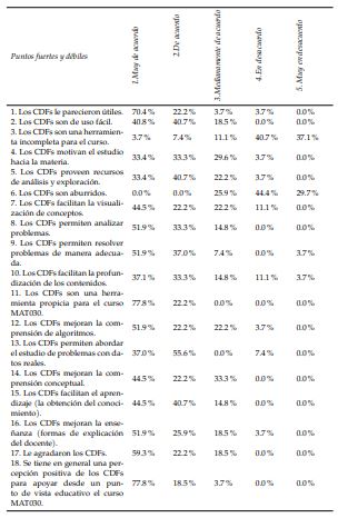 Al igual que en la dimensión analizada en la sección que precede, se escogieron como percepciones positivas, aquellas donde la suma porcentual en las valoraciones “1 = Muy de acuerdo” y “2 = De acuerdo”, dio como resultado un número mayor o igual a 70%. En consecuencia, predominan como juicios positivos sobre la calidad de los CDFs, los siguientes: los CDFs son útiles (92.6%), son de uso fácil (81.5%), son una herramienta completa para el curso (77.8%), proveen recursos de análisis y exploración (74.1%), no son aburridos (74.1%), permiten analizar problemas (85.2%), los CDFs permiten resolver problemas de manera adecuada (88.9%), facilitan la profundización de los contenidos (70.4%), son una herramienta propicia para el curso MAT030 (100%), los CDFs mejoran la comprensión de algoritmos (74.1%), permiten abordar el estudio de problemas con datos reales (92.6%), facilitan el aprendizaje (85.2%), mejoran la enseñanza (77.8%), agradaron a su población objetivo (81.5%), se tiene en general una percepción positiva de los CDFs para apoyar desde un punto de vista educativo el curso MAT030 (96.3%). Además, se rescatan como percepciones negativas: los CDFs no motivan el estudio hacia la materia (33.3%), los CDFs no facilitan la visualización de conceptos (33.3%), los CDFs no mejoran la comprensión conceptual (33.3%).