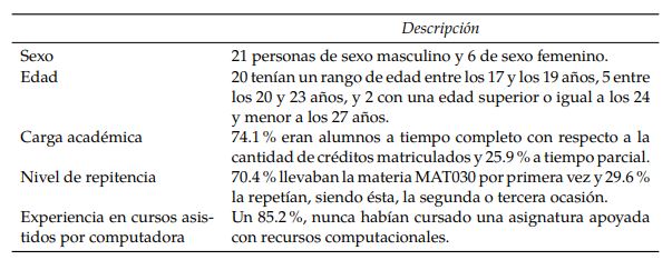 Por otra parte, adicionalmente, participaron de este proceso dos grupos de control que fueron asumidos por un académico de la Escuela de Matemática de la Universidad Nacional de Costa Rica, no perteneciente al equipo de investigadores. El método de enseñanza utilizado en estos grupos se fundamentó en una modalidad tradicional con clases magistrales y listas de ejercicios propuestas por la coordinación de la cátedra del curso MAT030, sin emplear ningún recurso adicional, ni software de apoyo.