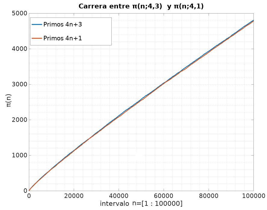 Ambas clases de números primos contienen un número muy similar de términos, según muestra la proximidad de ambos trazos.