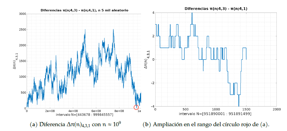 Para respaldar la Conjetura 2, se cambia el enfoque de calcular uno a uno los números primos para valores muy grandes de . Tomando 5 mil números al azar, con un valor máximo de = 109 se construyó la Figura 2a. En los datos numéricos se encontró un valor en = 951890755. Esto indica que alrededor de este valor de habrá una región en la cual las dos clases de números primos se aproximan (de hecho para ese valor de son iguales) y que puede haber cambio de signo.