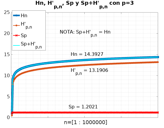 Para verificar la (7) en la Figura 4 se muestra un caso, con , de la construcción del número armónico como la suma del número subarmónico- () y su serie- parcial () asociada. Sobre la línea en color azul se puede ver, sobrepuesta, la suma la cual es aproximadamente igual al número armónico .