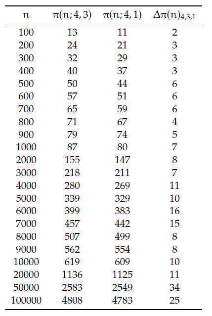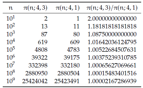 Se puede ver que la distribución de números primos en clases primitivas distintas, para el módulo 4, está en realidad igualmente dividida. Utilizando Octave, se calculó y , mostrados en la Tabla 1, donde se puede ver que son coincidentes con los resultados publicados en [4], pero hemos incluido una cuarta columna, la cual será útil en la siguiente sección, para mostrar el comportamiento del valor de, es decir, la diferencia entre ambas clases de números primos.