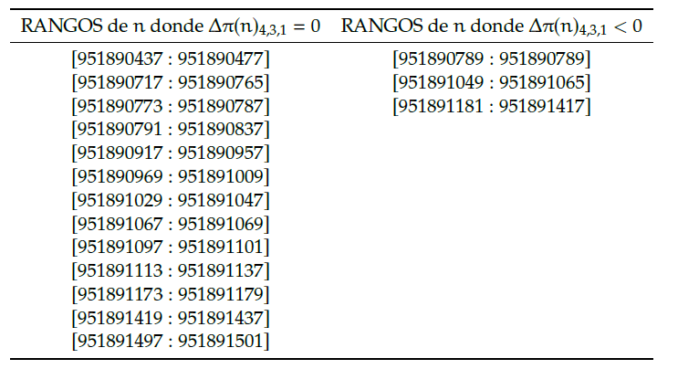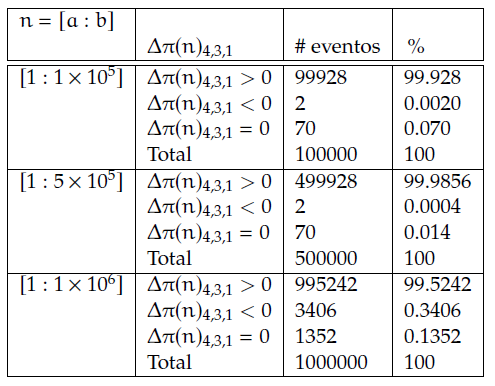 Los resultados mostrados en la Tabla 1 deben ser tomados con precaución, ya que si observamos todos los valores de , de uno en uno, desde 100 hasta 100 mil, entonces sí aparecen valores en los que (1) es negativa. Aunque de los cerca de 100 mil valores de sólo aparece un número pequeño de veces con signo negativo, hay un número mucho mayor en que es cero. Contar el número de veces en que no ha llamado mucho la atención hasta ahora, sin embargo, puede ser una cantidad importante ya que, para ciertos rangos de , es incluso varias veces mayor al número en que hay un cambio de signo a negativo.