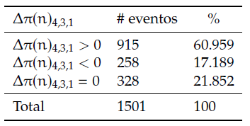 Enseguida se procedió a calcular en un intervalo = [951890001 : 951891499], es decir en 1500 puntos alrededor. Visualmente la Figura 2a no permite leer si hay valores negativos, ya que por lo regular el número de veces que es mayor que el número de veces que , de modo que se tienen que leer a los datos numéricos. En la Tabla 4 se muestra un resumen de resultados. Puede notarse que el procentaje de eventos en cero es mayor que el de eventos negativos.