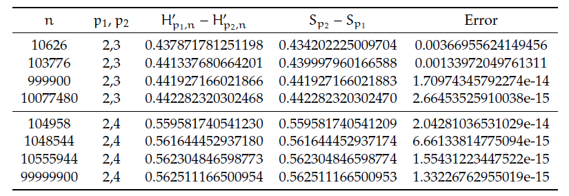 Sería impráctico mostrar todos los valores en los que (1) es negativa y cero, así que en la Tabla3 se muestra un resumen para diferentes intervalos de . En la primera columna se muestra el intervalo de n, en la segunda columna , en la tercera columna se indica el número de veces en que es mayor que cero, menor que cero y cero. En la cuarta columna se muestran los porcentajes para cada caso.