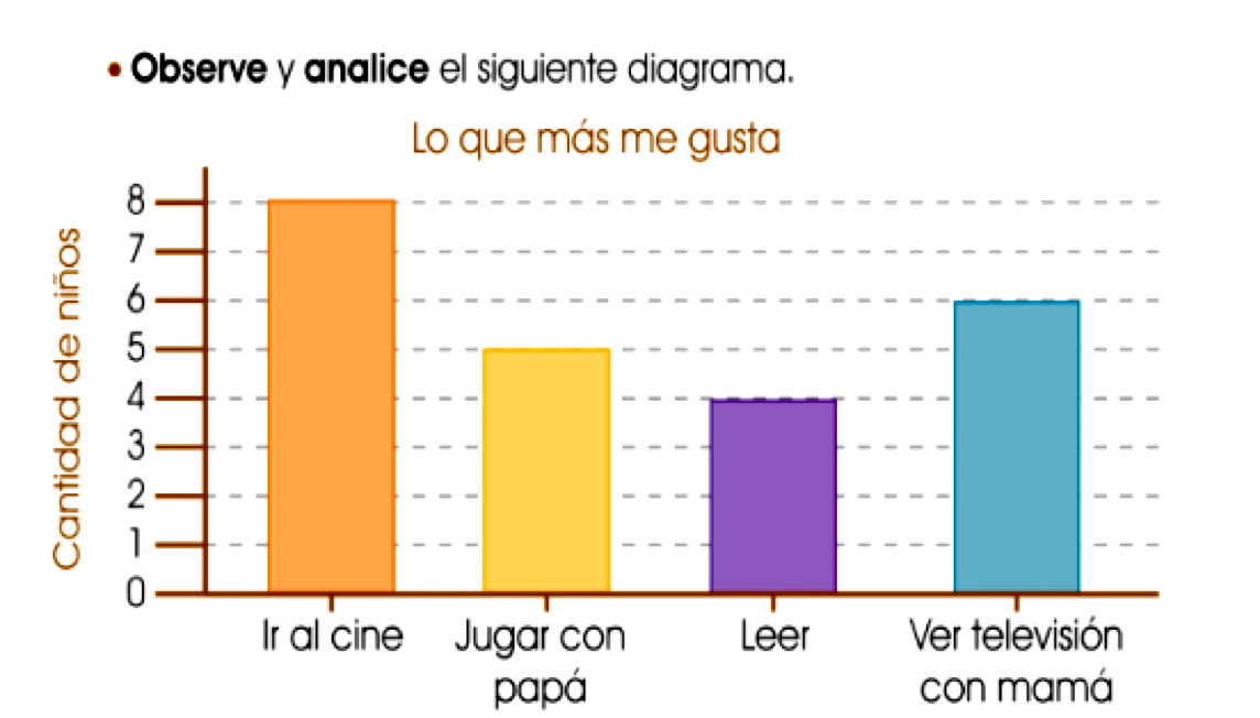 El trabajo con estos gráficos continúa en tercer grado con actividades de recolección, resumen y análisis de datos, así como también, la representación de resultados por medio de tablas y gráficos de barras y se introducen los conceptos de máximo y mínimo. Igualmente se plantea la habilidad para formular problemas simples que requieran la recolección de datos y su posterior análisis.