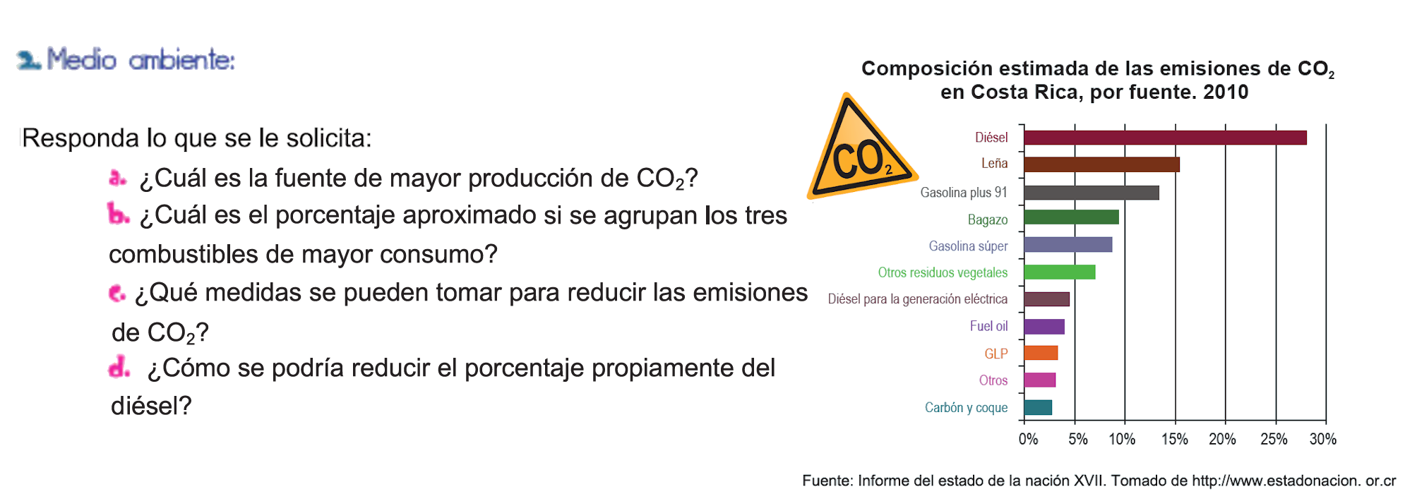 C4. Contexto científico: este contexto se relaciona con problemáticas del ámbito de la ciencia y la tecnología e incluye aspectos como: el clima, ecología, medicina, ciencia espacial, genética, medición y el mundo de las matemáticas en sí. Reproducimos un ejemplo en la Figura 9, en que, mediante un diagrama de barras se presentan los porcentajes en que diversas fuentes contribuyeron a las emisiones de CO2 en Costa Rica en el año 2010. Este contexto es el más complejo, pues los estudiantes deben tener conocimientos sobre el CO2 y sus emisiones y efectos. Así se plantea en la actividad una serie de preguntas, de las cuáles las dos últimas requieren una capacidad de lectura crítica y la búsqueda de información no contenida en el gráfico por parte del estudiante.