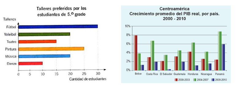 Gráficos de barras: utilizan barras, verticales u horizontales y de un mismo ancho para representar datos cualitativos o cuantitativos discretos. Están dispuestos en el primer cuadrante de un sistema cartesiano, en uno de los ejes se registra el valor numérico o modalidad de la variable y en el otro, las frecuencias, con una longitud proporcional de las barras. Se encuentran también variantes, como los gráficos de barras múltiples (ver Figura 1).