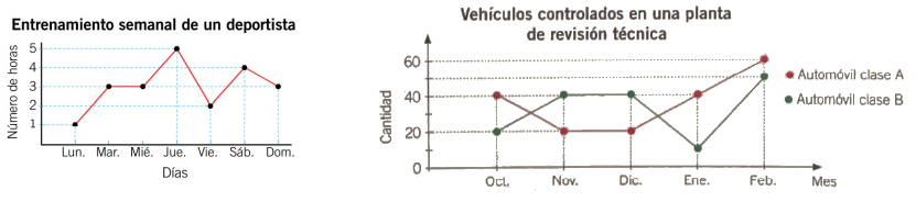Gráficos de líneas: es el gráfico en el que por lo general se utilizan puntos para representar la correspondencia entre el valor de la variable y su frecuencia de una variable en una serie de datos aislados y que se unen por medio de un segmento. Igual que en el caso anterior, este tipo de gráfico incluye gráficos de líneas múltiples que representan el comportamiento de dos o más variables a la vez. Ejemplos de estos gráficos en los cursos 4º y 6º se presentan en la Figura 2.