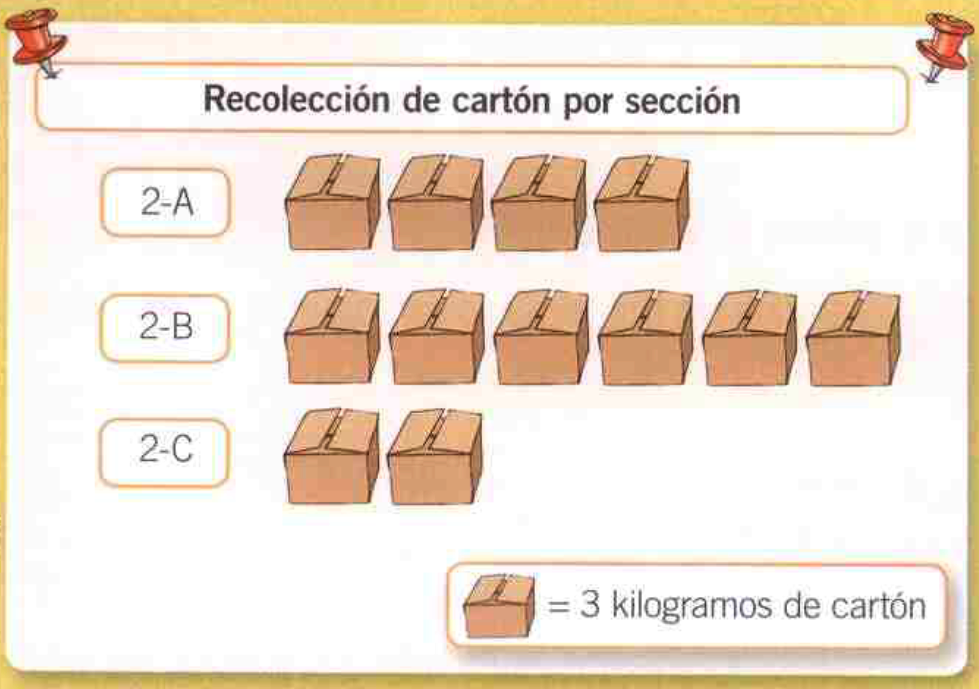 Pictograma: es un gráfico que utiliza íconos o imágenes del mismo tamaño, ordenados (horizontal o verticalmente) formando una especie de gráfico de barras, en las que las figuras alusivas al dato, representan una cantidad determinada de unidades. Un ejemplo del uso de pictogramas, lo encontramos en la Figura 3, donde cada imagen representada por una caja equivale a 3 kilogramos de cartón recolectados por la sección (grupo) de segundo grado respectivo.