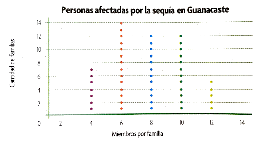 C3. Contexto social: son aquellas situaciones que se experimentan en las interacciones diarias con el mundo exterior y, por tanto, el foco de atención de la información representada es la comunidad (OECD, 2016). Corresponde a situaciones donde se aborda aspectos del ámbito social, más allá de la vida personal del niño; por ejemplo, que pueden tener lugar en su barrio, su ciudad o país. Pueden presentar información sobre elecciones, transporte público, gobierno, demografía, publicidad, estadísticas nacionales o economía. También hemos incluido en este contexto los juegos de azar por ser ampliamente utilizados en la sociedad. Un ejemplo se muestra en la Figura 4, donde se representa el número de personas que componen las familias afectadas por una temporada de sequía en Guanacaste. El contexto excede la vida personal del estudiante y aunque está situado en una provincia particular de Costa Rica, el estudiante puede comprender que la sequía no es un problema que le afecta sólo como individuo, sino que perjudica a una comunidad más amplia.