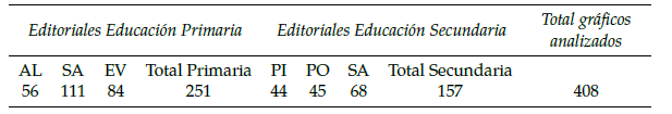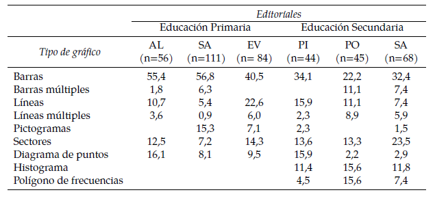En la Tabla 3 se presenta la distribución del tipo de gráfico en las diferentes editoriales analizadas en el estudio, separando las de educación primaria y secundaria.