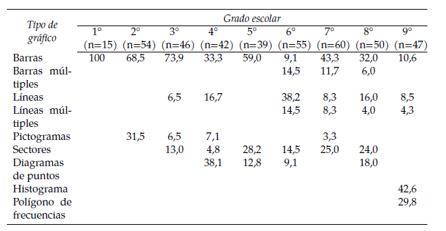 Las series analizadas incorporan mayor variedad de gráficos conforme se avanza el grado escolar. En primer año, sólo se presenta el gráfico de barras, en segundo se agregan los pictogramas y en tercero se suman gráficos de líneas y sectores circulares. En cuarto año, se agregan diagramas de puntos y en sexto grado se incorporan gráficos de barras y líneas múltiples. Estos distintos tipos de gráficos se mantienen en secundaria, pero en noveno año, su uso se concentra más en los histogramas y polígonos de frecuencia. No obstante, predomina el uso de gráficos de barras (y sus variantes) en los niveles de 7º y 8º año, con una incorporación importante de los gráficos de sectores en estos dos niveles.