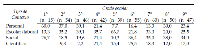 El contexto social es el más representativo de los últimos niveles, es decir de 6º a 9º año, siguiendo un comportamiento similar al destacado en Mateus (2014), lo cual guarda una relación lógica por involucrar a los adolescentes en los problemas sociales y de vida en comunidad.