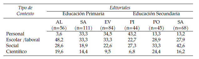 En la Tabla 5 se presenta la distribución del tipo de contexto que se utiliza en el gráfico en las diferentes editoriales analizadas en el estudio.