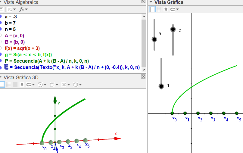 Escribiendo en la entrada la secuencia P se obtiene un lista o conjunto de puntos sobre el eje de modo que se tienen los puntos , para . Estos puntos se etiquetan con el comando Secuencia(Texto( <Objeto>,<Punto>), <Variable>, <Valor inicial>, <Valor final>) registrando en la entrada la siguiente expresión: