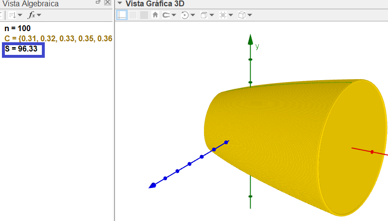 Para obtener la suma de los discos en la vista 3D de la Figura 10 utilizamos el comando Suma( <Lista>) y sustituimos que es el nombre de la lista de los discos y a través del deslizador le damos el valor de n = 100. El deslizador fue creado con n = 100 pero podemos configurarlo y darle más valores para obtener una mejor aproximación . Registrando en la entrada S=Suma( C ) se obtiene el valor de la suma en la vista algebraica de la Figura 11.