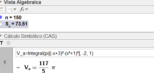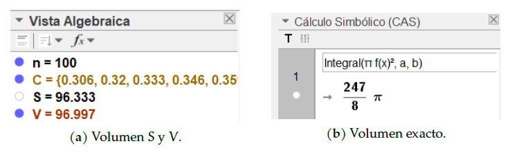 Para obtener el volumen aproximado a través de las sumas, variamos n hasta 150 e ingresamos en la entrada obteniendo este valor en la vista algebraica. El volumen del sólido de revolución mediante la integral (7) se obtiene escribiendo en la entrada de la vista CAS la siguiente sintaxis . Estos dos valores se ilustran en la Figura 17.