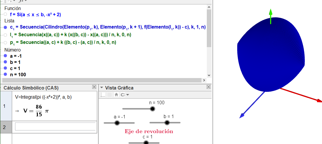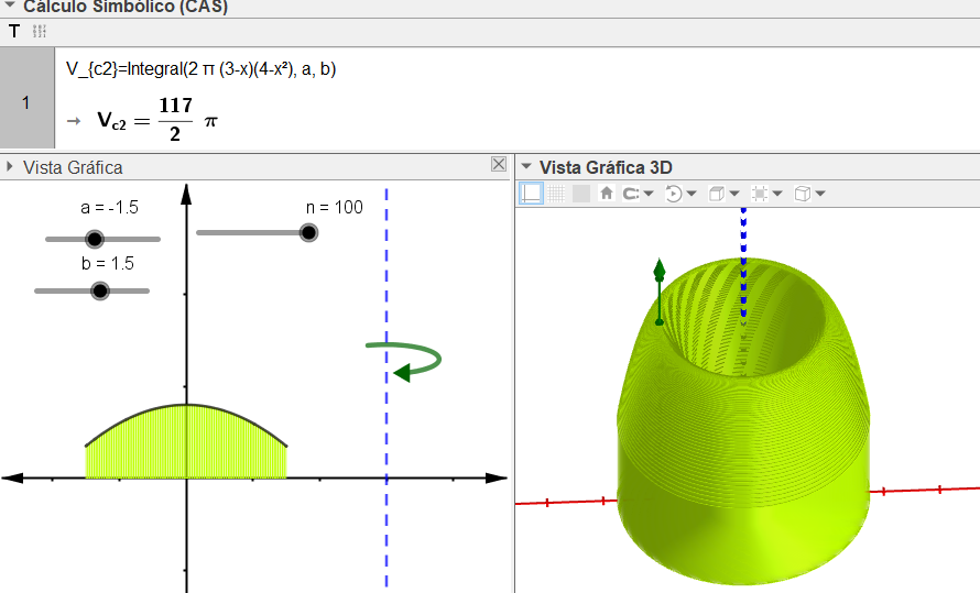 En la lista Lxc se ha añadido el elemento tres porque el eje de rotación es x = 3 y el radio de cada capa cilíndrica en la lista Capas2 es 3 − (a + (k − 1)(b − a)/n). Para calcular el volumen ingresamos en lavista CAS