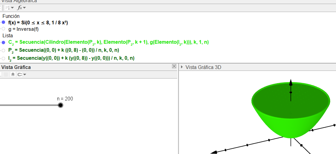 Definimos el número de discos a través de un deslizador que varíe desde 0 a 200 con incremento 1, ingresamos la función con la sintaxisenseguida le sacamos la inversa a esta función con el comando Inversa( <función>) sustituimos f en el argumento de este comando, luego creamos las listas l2, P2 y C2: