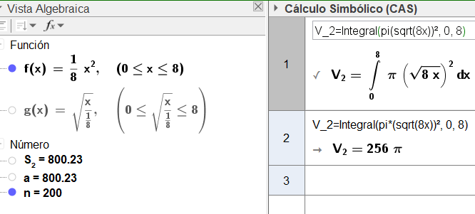 Para obtener el valor de las sumas de los 200 discos se introduce en la entrada S2 = Suma(C2) y para obtener el volumen exacto mediante (6) se ingresa en la vista CAS y se tiene la Figura 15, donde S2 es el volumen aproximado por sumas de Riemann y V2 es el volumen del sólido de revolución.