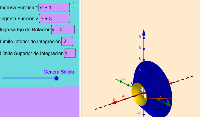 A continuación, en el Ejemplo 1 se crea un deslizador c que varía de -7 a 7 con incremento 0.5. Este ejemplo muestra otro caso particular cuyo eje de rotación es y = 1. Variando este eje por medio del deslizador se pueden obtener otros sólidos con volúmenes distintos.
