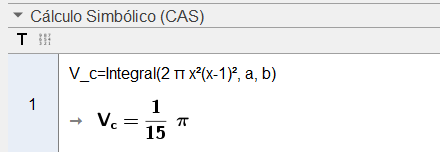 El volumen del sólido S se obtiene utilizando (9). Considerando como la altura, el radio x y los límites de integración a = 0 y b = 1 ingresamos en la vista CAS la sintaxis y se tiene el volumen Vc de la Figura 20.