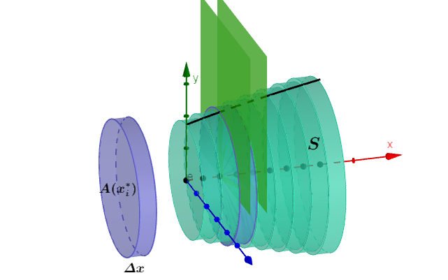 Luego hacemos un corte al sólido perpendicular al eje en cada uno de los () puntos . Observe que si es grande, entonces cada rebanada del sólido será más delgada con un área de sección transversal casi constante (Smith y Minton, 2012). Stewart (2018) afirma que si se eligen puntos muestra en , se puede tener un valor aproximado de la -ésima rebanada de por un cilindro cuya base tiene área altura . Por lo tanto, el volumen de la -ésima rebanada es aproximadamente y al sumar los volúmenes de estas rebanadas (Ver Figura 3), seobtiene un valor aproximado del volumen total del sólido de revolución mediante la expresión:
