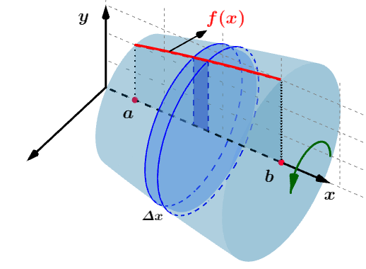 Suponga que y f es continua en el intervalo . Tome la región delimitada por la curva y el eje , para , y gírelo alrededor del eje , esto genera un sólido. Podemos encontrar el volumen de este sólido cortándolo de forma perpendicular al eje y reconociendo que cada sección transversal es un disco circular (ver figura 3 y 5) de radio , entonces el volumen está dado por (Smith y Minton, 2012, p.328).