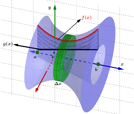 donde CR y Cr representan el conjunto de cilindros (vista 3D) bajo g y f respectivamente. La región verde entre f y g de la vista 2D genera el sólido verde de la vista 3D al rotarla respecto a la recta y = 0, asimismo la región azul al girarla alrededor de este eje representa el sólido interno color azul de la vista 3D, tal como se muestra en la Figura 16.