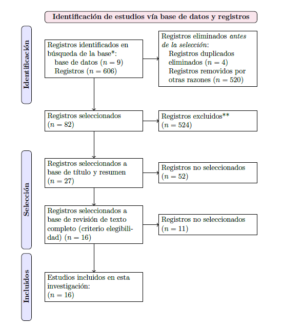 En dicha figura se evidencia que, de las 9 bases de datos académicas distintas, se obtuvo 606 fuentes tanto en inglés como en español, de los cuales después de analizar y quitar las fuentes duplicadas y una vez aplicados los criterios de inclusión y exclusión se mantuvieron únicamente 14 artículos y 2 capítulos de libro.