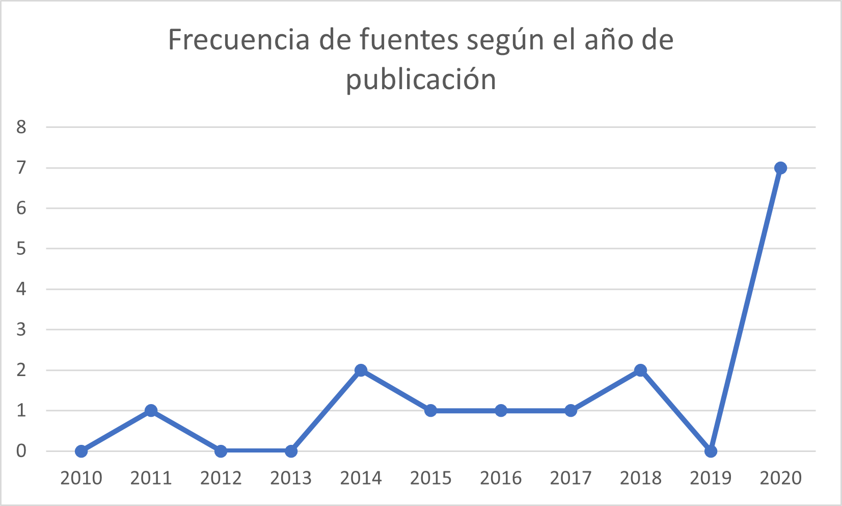 A partir de esta figura, se evidencia que en el último año ha habido un creciente interés en investigar la alfabetización estadística de los profesores en ejercicio, ya que de las 16 investigaciones analizadas siete corresponden al año 2020, seguido de tres del año 2018, en los demás años han habido al menos una publicación por año excepto en el 2012, 2013 y 2019 donde no se encontraron investigaciones relacionadas con el tema, esto rectifica lo reportado en la revisión sistemática elaborada por Aziz y Rosli (2021) quienes a pesar de enfocarse en la alfabetización estadística de los estudiantes también reportan el poco interés en investigar bajo esta línea de investigación.