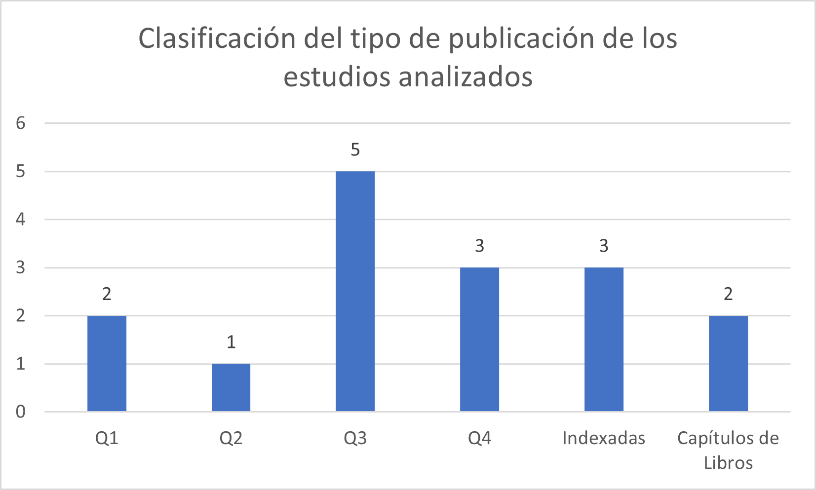 En la figura 4, se observa que el mayor número de los estudios analizados se encuentran publicados en revistas con factor de impacto, los cuales en su mayoría se encuentran en el cuartil 3 (Q3), seguido de publicaciones que se encuentran en el cuartil 4 (Q4). Un par de estudios se publicaron en revistas que se ubican en el punto más alto de la clasificación (Q1) y un estudio en el cuartil 2 (Q2). A partir de los resultados se podría inferir que, en los últimos 10 años, las revistas con factor de impacto han tenido un interés en publicar este tipo de temática. Asimismo, tres de las investigaciones se encuentran publicadas en revistas indexadas en bases de datos académicas y dos son capítulos de libros.
